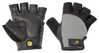 Gélbetétes finom kecskebőr tenyerű, valamint lycra és neoprén kézhátú ujjatlan kesztyű tépőzárral összehúzható mandzsettával.