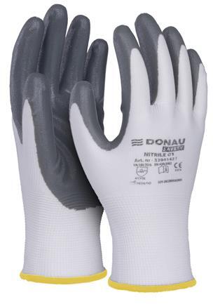 Jó minőségű, fehér színű, kötött poliészter szövetből készült kesztyű, szürke nitril bevonattal a markolat részen. -összeszerelési, raktározási, mechanikai, szervizelési, szállítási, építési, javítási, ipari, mezőgazdasági, kertészeti és hobbitevékenységekhez tervezve -szürke nitril bevonat, nagy kopásállósággal -száraz és olajos környezetben való használatra tervezve -rugalmas szegéllyel ellátva -mechanikai sérülések ellen védő kesztyű -kategória: II. -megfelel az EN 388:2016+A1:2018 (4131X) és EN ISO 21420:2020 szabványoknak -anyagok: poliészter/nitril -méret: 8/M -szín: fehér-szürke