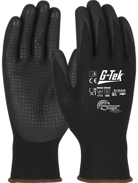 Újrahasznosított, varrat nélküli kötött kesztyű fekete nitrilhab markolattal. 60% újrahasznosított PET vizes palackokból és 10% elasztánból készült.