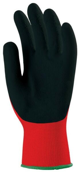 13-as kötésű, piros, kopásálló poliészter alapkesztyű tenyerén érdesített, csúszásbiztos fekete latex mártás gumírozott mandzsetta, szellőző kézhát kiválóan alkalmas intenzív fizikai munkákhoz akár nedve s körülmények közt is